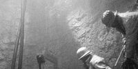 Main photo: A detail from the photograph: David Goldblatt: The last of the bigger rocks has just been dropped into a kibble. Now, with shovels, the team "lashes" (loads) the small stuff into the kibble. (Silver gelatin on fibre based paper, 52 x 35cm)