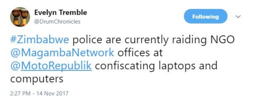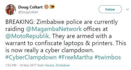 In the meantime, some blatantly false imagery has already appeared on social media. One such example to look out for is this video clip, purportedly showing a military convoy headed toward Harare (except that it is a video from another location and another time, as evidenced by the beautiful clear weather despite the cloudy, raining conditions in Harare today).