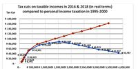To use the quick tax cut reference guide in Diagram 1: Go straight up from the chosen taxable income at the bottom, to a point on the schedule for 2016 or 2018. Read what the tax cut is on the scale to the left compared to the tax policy of 1995-2000.
