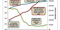 The top 45% tax rate was abolished in two steps in 2000 and 2001. But the main factor behind the lower tax rates was eight years of moving tax brackets upwards above the rate of inflation. In 2005, the inflation rate was 4%, but the top tax bracket was lifted from R300,000 to R400,000, that is by 33%. It amounted to a tax cut revolution.
