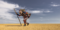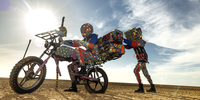 The second image depicts two travellers, on a motorbike, in the red, cracked no-man’s land. One is pushing the overladen bike. The other rides it. All characters in the image – human and objects – are covered in the signature fabric, including the baggage and the motorbike.