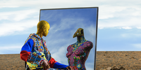 From the flat plane to three-dimensional sculptures: On the gallery floor is the actual motorbike – a spectacular sculpture fully encased in the signature colour shield. The haunting spectres from the photographs are now sculptured torsos covered in the same eponymous shell – each one a reified spirit of travel.