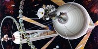 "O’Neill Cylinder exterior. The modules on the large ring structure around the endcap are used for agriculture. Each module could have differing environments ideal for a particular set of food items" - National Space Society. Painting by Rick Guidice courtesy of NASA. An illustration of the interior of an O'Neill space colony. Picture: Blue Origin An illustration of the interior of an O'Neill space colony. Picture: Blue Origin