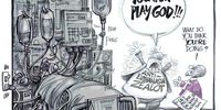 In the cartoon, Tutu is seen at the bedside of a dying patient being kept uncomfortably alive by a mountain of machinery. The cleric is holding a newspaper quoting his utterances in favour of euthanasia, while an 'Anti-euthanasia Zealot' screams at him in protest: “YOU CAN’T PLAY GOD!”. Tutu calmly replies; "What do you think you’re doing?” It’s a response that reflects the advice Tutu's father once gave him… “Don't raise your voice, improve your argument.”