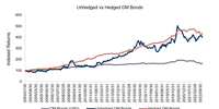 But does that mean we need to remove this risk and, if so, how? Investment managers can remove the currency risk in portfolios by using either futures/forward contracts on the currency or options to hedge an investment’s currency exposure. When using futures/forward contracts, the idea is to completely neutralise the impact of currency moves and it doesn’t cost much. You are still gaining the long -term interest rate differential (the difference in interest rates between two countries). So for example, if you’re a South African investor and you hedge your USD exposure, you don’t lose out when the rand depreciates, you just participate in a much smoother way. The example of developed market bonds is shown below. For a South African investor, over time you do benefit from the depreciation of the rand but it comes with volatility in performance over time (blue line).