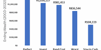 We used FTSE/JSE All Share Index (ALSI) return data from January 2003 to December 2022 and replicated the Schwab study by comparing the outcome of the above five strategies. As expected, the results, which are shown in the following graph, are uncannily similar for the SA equity market; the ‘Perfect timing’ strategy outperformed ‘Invest immediately’, which outperformed ‘rand-cost average in’, which outperformed ‘Worst timing’, all of which materially outperform ‘Staying in cash’. The ‘Invest immediately’ strategy generated an annualised return of 12.5% per annum over the 20-year period, almost 6% per annum ahead of the 6.6% per annum annualised return delivered by ‘Staying in cash’.