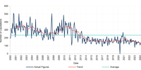 An increase in liquidations and insolvencies intuitively suggests a weaker economic environment with the potential for adverse downstream effects linked to higher unemployment, lower household incomes and weaker consumption and corporate earnings. Despite the increase in the latest print - compared to a year ago - the number remains below the long-term average with a downward trend.