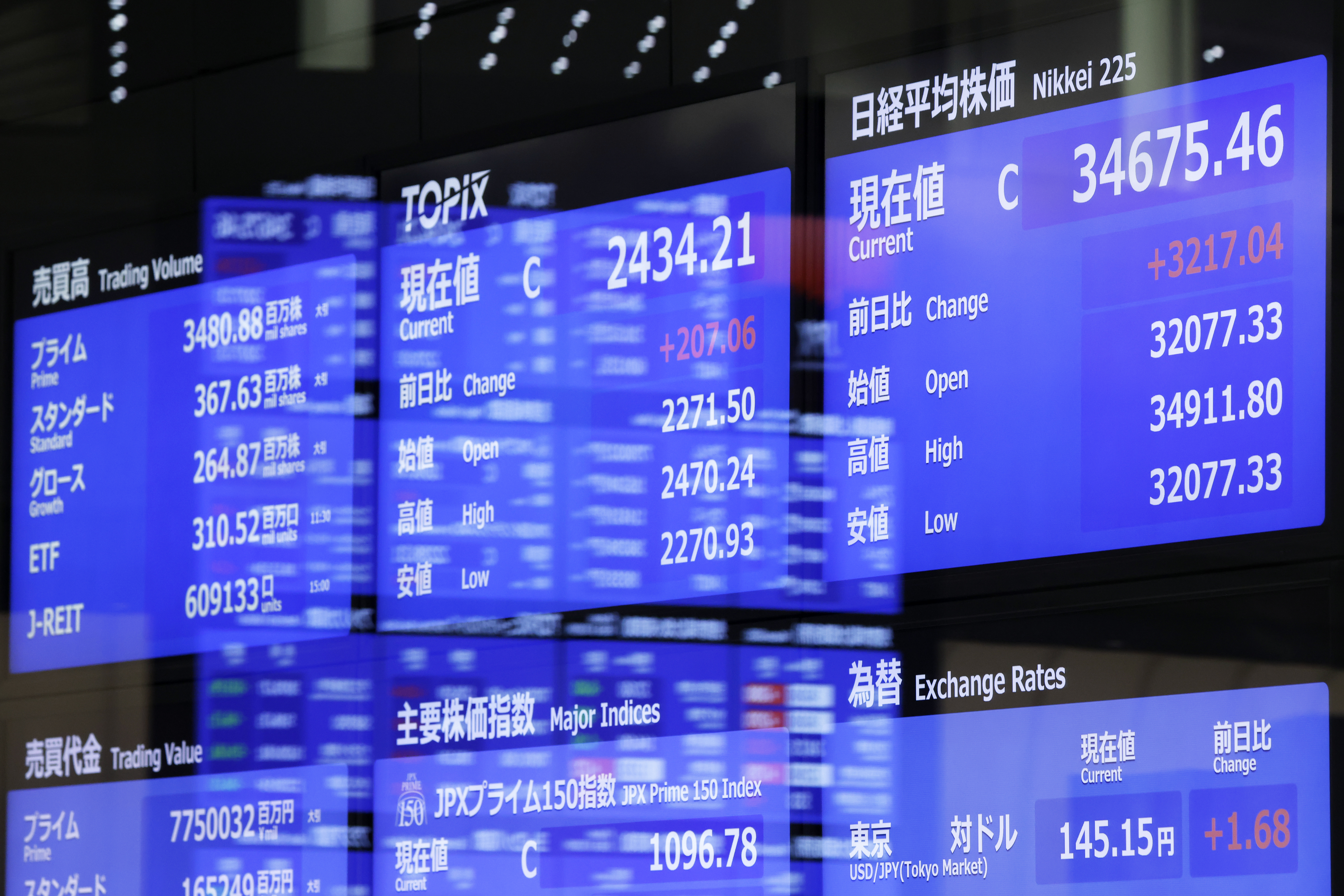 An electric stock board at the Tokyo Stock Exchange (TSE) in Tokyo, Japan.