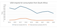These tariffs had a significant negative impact on South African exports, with the volume of US imports of aluminium products from South Africa falling by 57% and of iron and steel falling by 27% between 2017 and 2019 (see diagram below). The value and volume of US imports of these products from South Africa have still not reached prior levels.