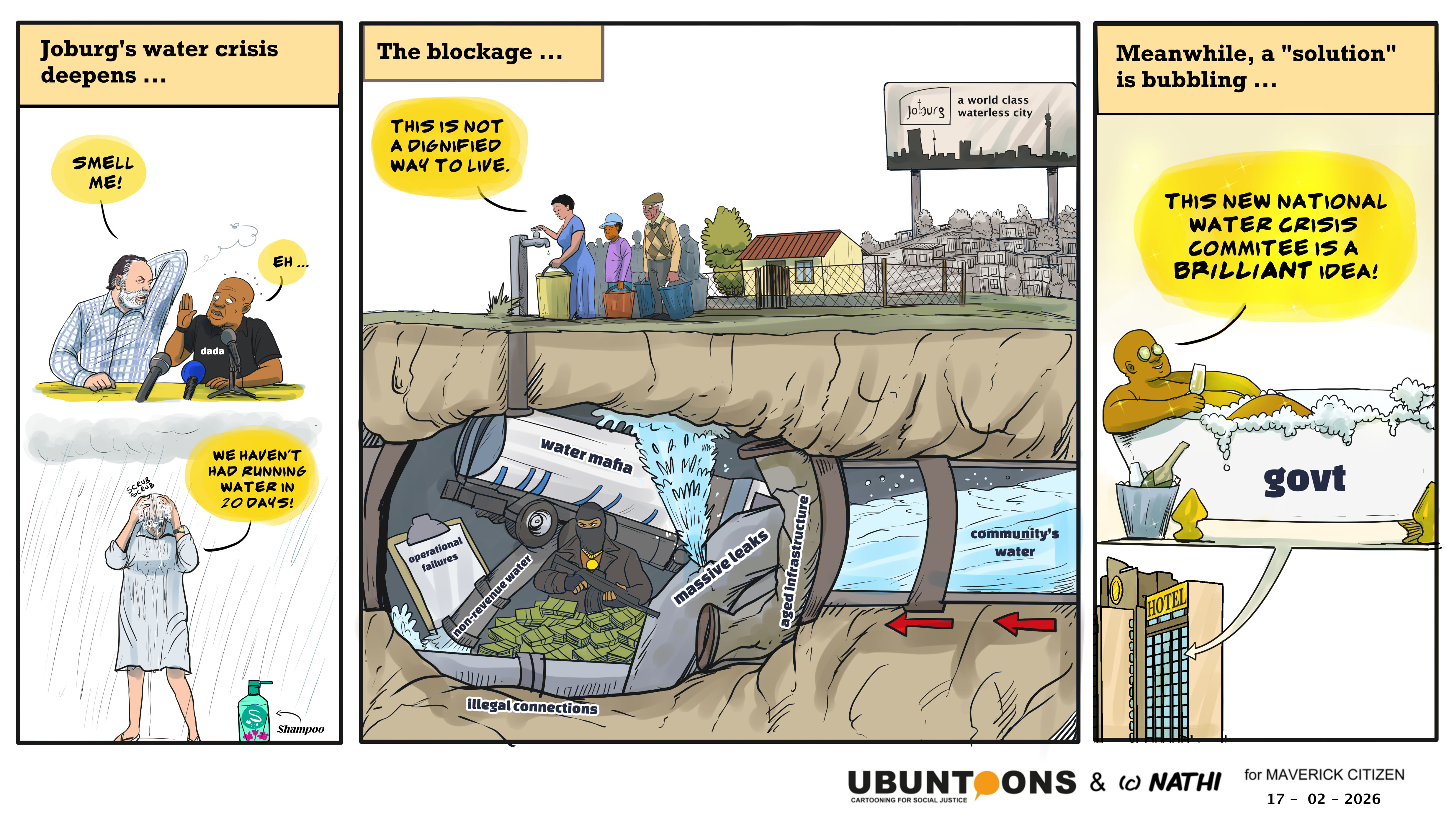Maverick Citizen Tapped Out By Nathi and UBUNTOONS 17 Feb 2026 Dive Deeper Speed Read Listen Dive Deeper Maverick Citizen joburg water crisis water mafia water infrastructure joburg water