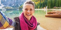 A happy woman taking a selfie.