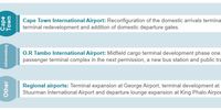 Flagship projects include a reconfiguration of the domestic arrivals terminal at Cape Town International Airport, a new bus station and public transport interchange at OR Tambo International and a terminal expansion at George Airport.