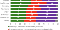 The chart shows that only 28% of people surveyed in Gauteng said democracy was preferable to any other kind of government; 26% said that in some circumstances, a non-democratic government could be preferable, while 39% were “fatalistic”, saying the system didn’t matter.