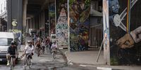 Riders pass street art in Newtown as they make their way into the city centre. (Photo: Ihsaan Haffajee)